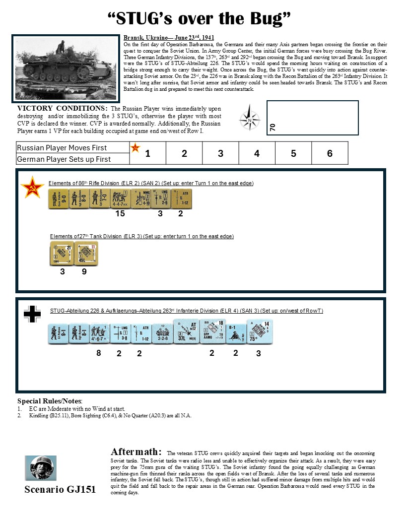 On the first day of Operation Barbarossa, the Germans and their many Axis partners began crossing the frontier on their quest to conquer the Soviet Union. In Army Group Center, the initial German forces were busy crossing the Bug River. Three German Infantry Divisions, the 137th, 263rd and 292nd began crossing the Bug and moving toward Bransk. In support were the StuG’s of StuG-Abteilung 226. The StuG’s would spend the morning hours waiting on construction of a bridge strong enough to carry their weight. Once across the Bug, the StuG’s went quickly into action against counter-attacking Soviet armor. On the 23rd, the 226 was in Bransk along with the Recon Battalion of the 263rd Infantry Division. It wasn’t long after sunrise, that Soviet armor and infantry could be seen headed towards Bransk. The StuG’s and Recon Battalion dug in and prepared to meet this next counterattack.Attacker: Russian (86th Rifle Division with 27th Tank Division)