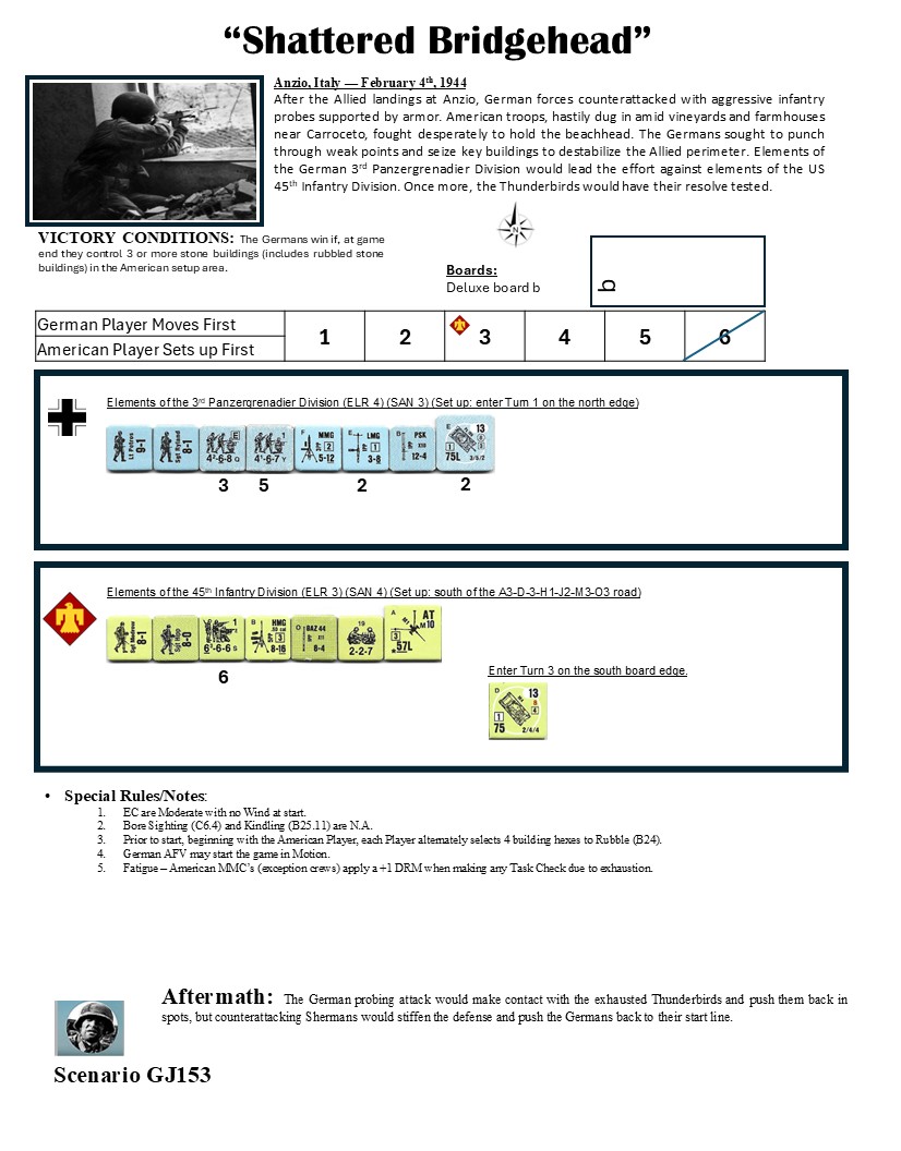 After the Allied landings at Anzio, German forces counterattacked with aggressive infantry probes supported by armor. American troops, hastily dug in amid vineyards and farmhouses near Carroceto, fought desperately to hold the beachhead. The Germans sought to punch through weak points and seize key buildings to destabilize the Allied perimeter. Elements of the German 3rd Panzergrenadier Division would lead the effort against elements of the US 45th Infantry Division. Once more, the Thunderbirds would have their resolve tested.Attacker: German (3rd Panzergrenadier Division)
