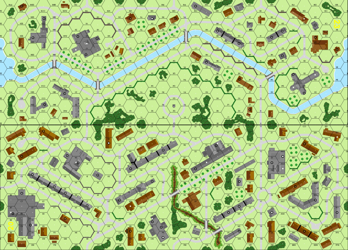 My units east of the river were set up to quickly retreat across the bridges, and they did so. This provided the Germans an uncontested approach to the northern bridge, and they had their first units at the entry of it at the end of Turn 2. Another decent-sized force moved up behind cover of the hedgerow toward the center bridge (this, and the one just south of it the only bridges clear of rubble), and another token force moved on the south. The last batch of reinforcements made it obvious that the strongest infantry push would be in the north. Turn 3 saw a HT race over the center bridge and off, but the AC and the Panzer were both stopped at the German-side entry of the bridge (the latter burning), providing some infantry cover at least. A Russian squad was taken captive in its attempt to block the north bridge. Turn 4 saw the hot AT gun smoked in by the StuG, allowing the other HT and two trucks to drive off, aided also by the ridiculously poorly constructed SSR4. Another Russian squad was lost in the north, and the Germans now had their bridgehead. The much-needed Russian reinforcements of course chose to enter up there, as half the current Russian force situated there were dummies. Turn 5 saw the StuG fall in the same hex as the AC, the Russian HMG overheat while rebuffing the central German force, and the Germans exploit their northern bridgehead. Had you asked me at this point what I thought the German's chances would be I would've guessed practically zero, but I was proven wrong on Turns 6-9 in what would be one of the most exciting sessions of ASL I've ever played. Andy pushed his troops hard, and was rewarding by averaging about 5 on his MCs. If his IFT rolls would've matched these the game would've been over quickly, but here he was about as cold as I've ever seen dice (averaging almost 9 at one point), with a fair bit of 12s in the mix to break some MGs and reduce his ammo-short men. By the end of Turn 6 my northern troops were almost hugging the border, staying out of LOS of his 9-2 kill stack. Turn 7 was a disaster for him in the middle though, with everybody being broken and rounded up as POWs. He did manage to eliminate my crew in CC, but these men were busted up trying to dash across the road on Turn 8. In the north things fared much better, with him storming up and catching some of my men in open ground, rounding up a squad and leader as further potential exit VPs. I was lucky enough to survive a 8+0 in the far north though after whiffing on my 16+0, allowing me to advance and tie him up in CC in the woods adjacent to the board edge. My tank survived a PF shot to back into bypass to cover one of the four hexes he could exit from, I moved men into the upper levels to cover another, and men up to the wall and in the woos to hopefully the other two. Had he connected on his only prep shot in Turn 9 I think he would've had a safe haven, but his 6+1 only managed to pin my HMG squad, disallowing a FL at least. 12 VP of infantry were guaranteed as they AM'd off, joining the 12VP of vehicles previously exited, seeing him only need 9VPmore to win, of which he had 15VP possible (2 of which would need to infiltrate out of CC). One squad AM to the edge - pass. Another squad same - pass. 8-0 leader guaranteed exit - 1VP. But disaster struck when his 9-2/squad walked into snake eyes resid, and then final final saw another snakes eliminate one of the squads. Game over. I give Andy a lot of credit for sticking with what I considered an impossible situation, as it made for one hell of an exciting ending.