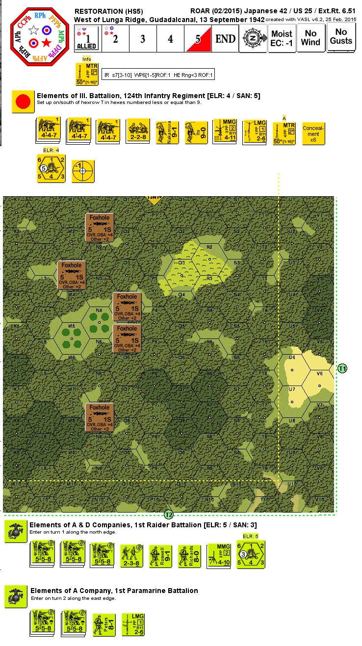 On the night of September 12th, leading elements of Major General Kiyotaki Kawaguchi's 35th Infantry Brigade attacked the positions of the Raiders to the west of Lunga Ridge, overrunning C Company's positions. By the morning the Raiders were forced back to the extent that their lines west of the hill were running north-south instead of east-west. Two companies of the Raider battalion were ordered to re-take the lost positions in a daylight attack. A company of Para-Marines, untouched in the previous night's fighting, were ordered to assist the Raiders.Attacker: American (USMC) (A & D Companies, 1st Raider Battalion and A Company, 1st Paramarine Battalion)