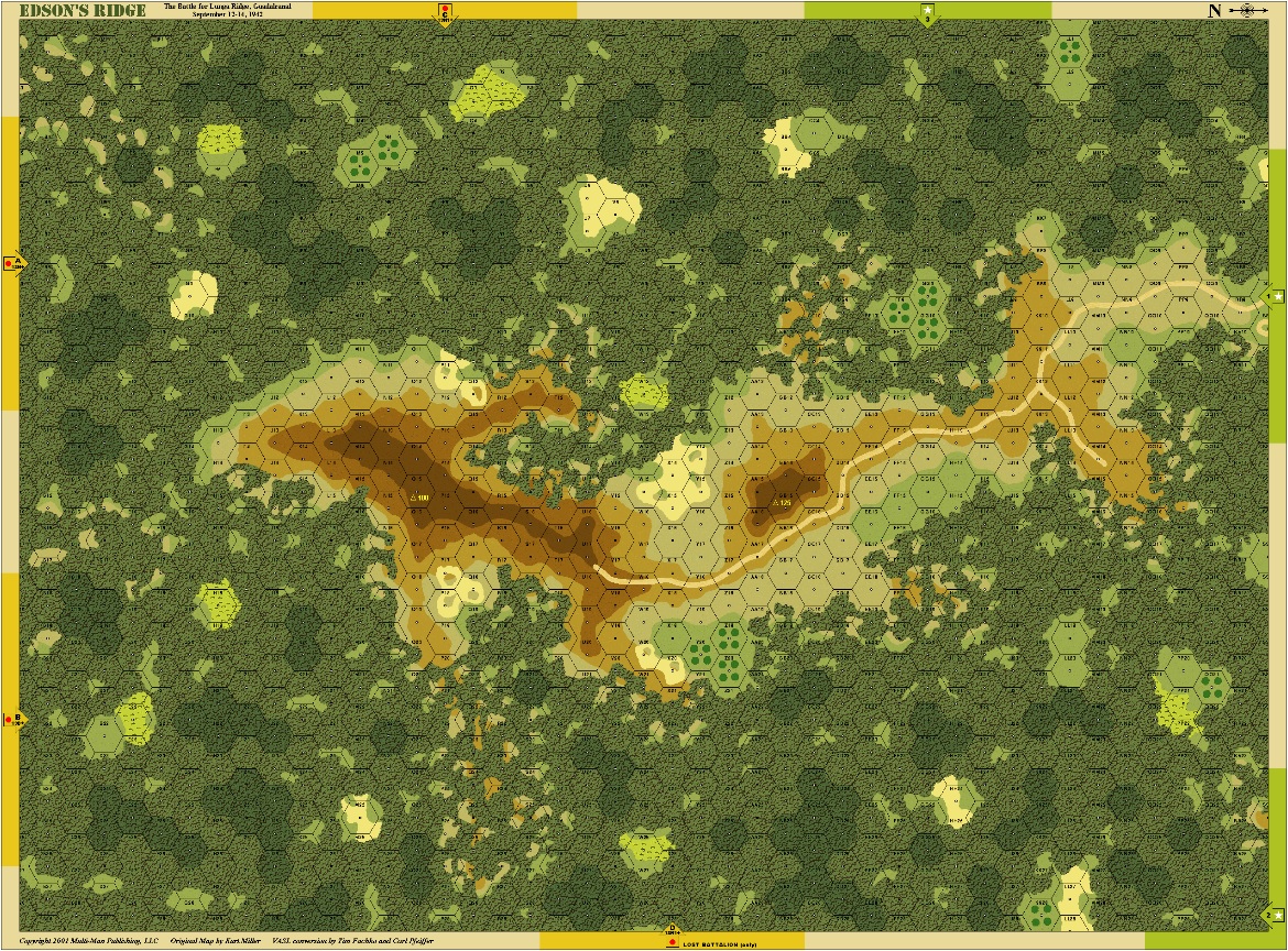 The Edson’s Ridge Campaign Game (ER CG) offers two or more players a series of consecutive scenarios relating to the epic struggle of September 12-14, 1942 for Guadalcanal’s Lunga Ridge, just south of Henderson Field. Using the following rules, a variable number of scenarios will be played, each simulating a segment of the battle for this critical hilltop and access to Henderson Field.Attacker: American (USMC) (B Company, 1st Raider Battalion; B Company, 1st Parachute Battalion)