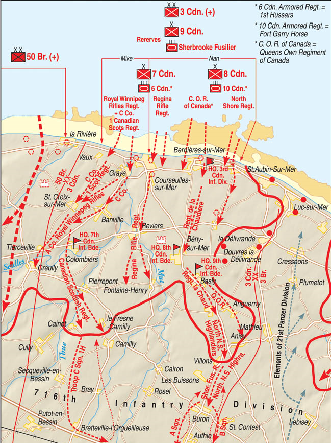 The port of Courseulles-sur-Mer was a German strongpoint, known to contain numerous AT guns and MG nests. The task of neutralizing these installations was given to the Canadian 7th Brigade and the hardpoints west of the River Seulles were detailed to 'B' Company of the Royal Winnipeg Rifles. As they neared the beach it was evident that they would have to start without the support of AVREs or DD Shermans. Elsewhere the naval bombardment might have succeeded, but in front of 'B' Company the German defenses appeared very much intact. The landing craft came under fire before the troops were disgorged to commence their Dieppe-like frontal assault on the strongpoint. . . . Mike Red depicts the part of D-Day landings at Courseulles-sur-Mer, the most heavily fortified position – “Mike Red” – that the Anglo-Canadian forces had to face on Juno Beach. A total of 16 Canadian squads bore down on 5 second line German squads and 6 gun crews. The crews, with their 8 morale and self rallying ability, were the backbone to the whole German defence. The Canadians win by clearing all pillboxes of good order Germans and by exiting 7 VPs of personnel in 7 turns.Attacker: Canadian (Company B, Royal Winnipeg Rifles, and Assault Team of 6th Field Company, RCE/A Squadron, 6th Canadian Armoured Regiment)