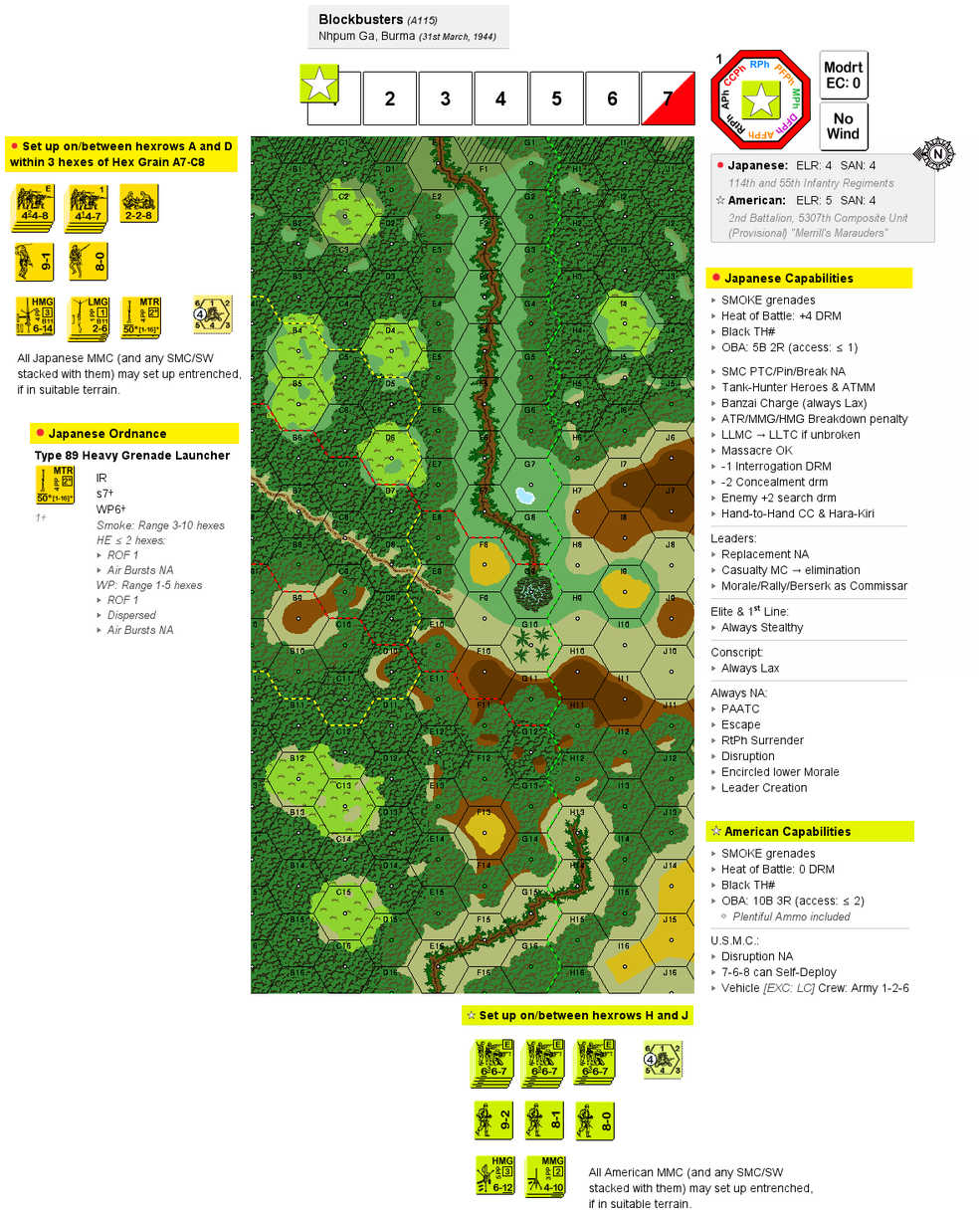 On the fourth day of fighting at Nhpum Ga, elements of the Japanese 114th and 55th Regiments were able to completely surround the 2nd Battalion of Merrill's Marauders. The Japanese established a block on the trail just north of Nhpum Ga, severing contact between the 2nd Battalion and the 3rd Battalion at Hsamshingyang. The morning patrol leaving Hsamshingying detected signs of enemy activity along the trail, and encountered a strong Japanese trail block about 400 yards from the 2nd Battalion's perimeter. With mortar support from Nhpum Ga, the patrol attacked the block but finally had to withdraw. Colonel McGee decided to make another attempt to break the block and carefully thinned out his perimeter to form a strike force and attacked again. . . . .One of the scenarios that makes the Nhpum Ga series so great. US forces must attack Japanese troops and clear a track, while also ensuring that the Japanese do not infiltrate into the US set up area.Attacker: American (2nd Battalion, 5307th Composite Unit (Provisional) "Merrill's Marauders")