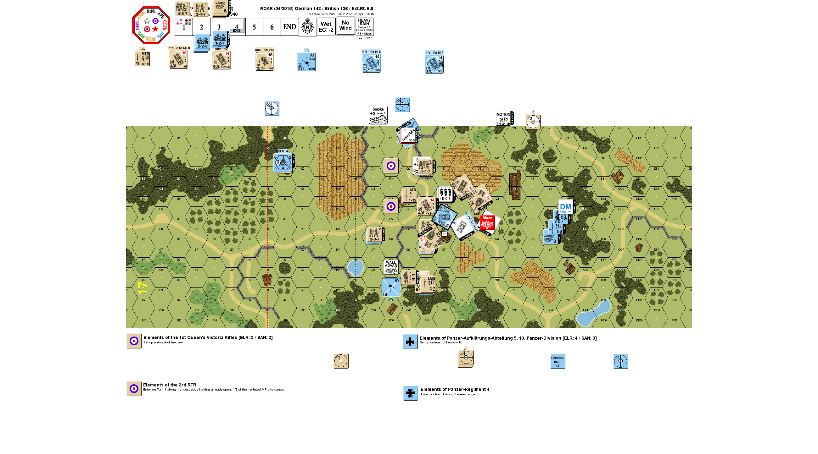 | Misc Rules: | Heavy Rain (E3.51) is falling and will not stop! Hedges: Walls. Bldgs: Wooden. |