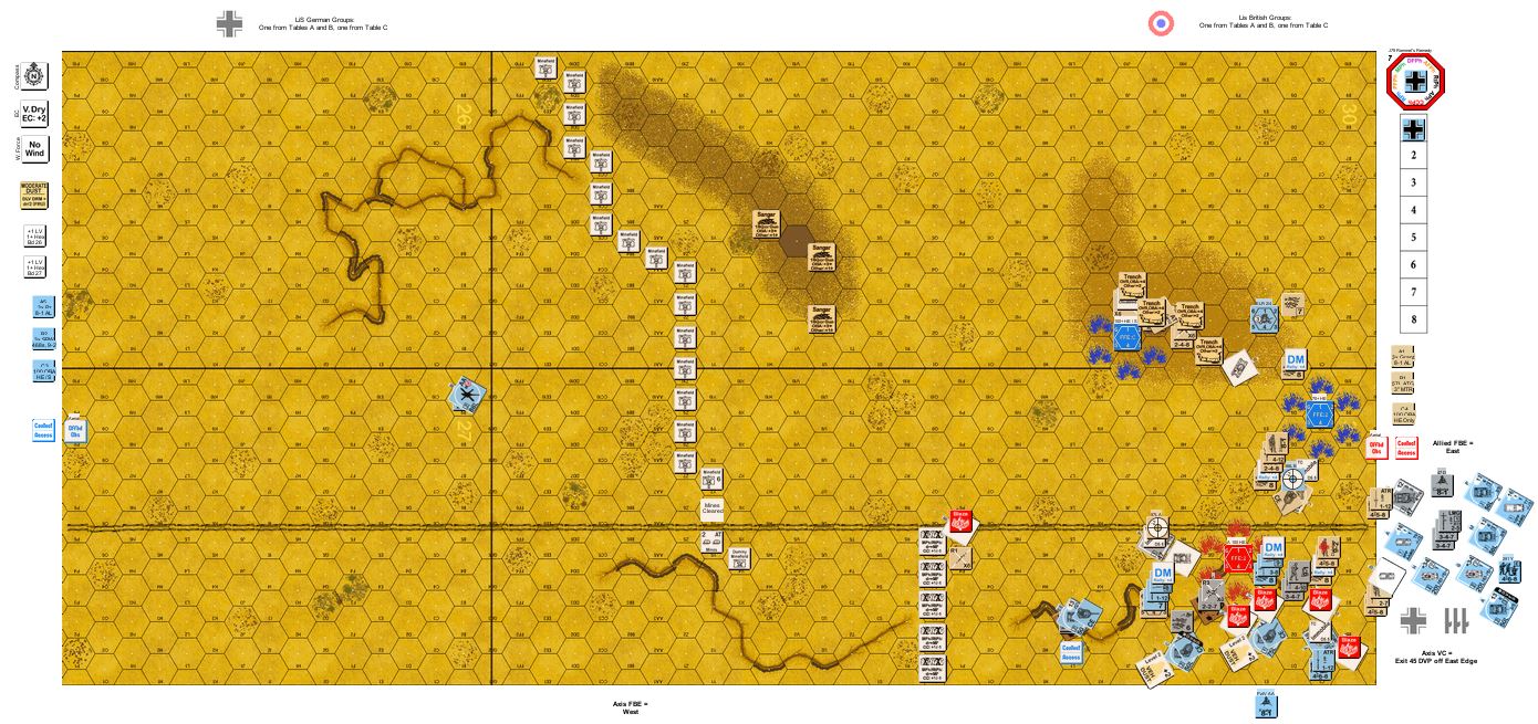 J79 Rommel's Remedy Tom and I have talked about playing the desert for awhile and finally decided to take a break from PiF to play some Shelling gold. We're undertaking the entire Line In The Sand Mini and this is the first scenario in what looks like a very fun trilogy. Like all three of Pete's mini's the players start with a fixed OB but can choose some add-ons to tailor their forces. I choose 4 x PzIIIH, the 8 rad AC group and FB w/ no bombs and the Mtr/AA gun combo. Tom went with the Valentines, AA/AT combo and FB w/ bombs. My plan was simple, don't stop just keep moving, smash through and run for the exit. Our playing of this scenario was highlighted by extreme swings of fortune and misfortune on the dice. I hit Tom's anti-tank mine belt (2at each hex) at four different locations and failed to detonate a single one. In fact, the only vehicle jacked by mine was Tom's own when he made a desperate move to stop my final AFV from exiting. He rolled at least 4 snake eyes on to hit rolls (including twice rolling triple 1's) one was an improbable hit, which became a normal hit, which bounced and the other was an AC bomb which hit a 1/2 track on the final exit hex but was a dud so the 1/2 track exited for VP. I never rolled a single snake eyes the entire game except on a PTC lol. Tom also, managed to break and repair 3 guns/main armaments and generate two heroes. My dice were despicable, and had it not been for a big sniper which took out a 9-2/hero stack which would have completely wrecked my AFV in CC this playing would never have gone down to the final turn. My only other two breaks were shooting down one of his A/C (first ever in my long ASL career) and my mortar getting an early hit/result on his backstop AA gun which never recovered. Even when I stopped to shoot it was ineffective. The Italian infantry was useless, they infiltrated up the wadi but could get no further and had I relied on them to pierce the mine belt it would have been an epic fail, their armor was useful however. Tom ignored them for the most part and I managed to sneak one down the board edge and make a dash for the exit and the win. Tom managed to make the aforementioned last turn repairs and moved all guns to stop the tank. In the end, it was his A/C with another CH bomb that did the tank in. Yes folks, two AC with bombs snake eyes for both!!! The luck of the Irish I guess! Fun scenario, highly recommended take the balance if your the Axis.