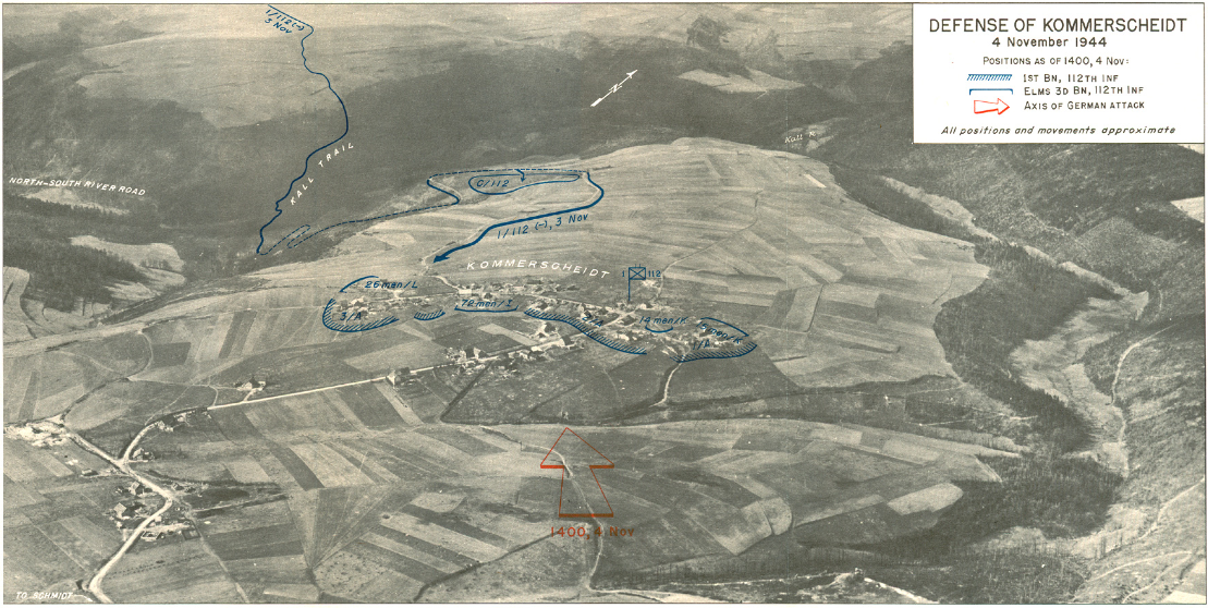 The US 28th Division made a limited flanking division in the Huertgen Forest to take the town of Schmidt. Although the town fell easily to the divisional attack, a strong German counterattack soon followed and routed the Schmidt defenders. Moreover, the German attack continued and threatened to overrun the next defense line located in the small village of Kommerscheidt.Attacker: German (3rd Battalion, 1055th Infantry Regiment, 89th Division and 16th Panzer Battalion, 116th Panzer Division)