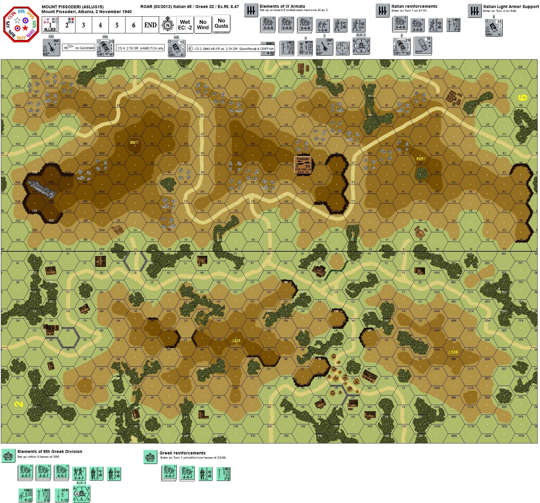2024-11-22(A) Mark Thompson vs Dan Lepore Greek winThe Greek plan of attack was to push through the 9L2-L5 road valley and approach the victory hex from the rear through the cover of crags while interdicting reinforcements with HMG/LMG teams on 2P5/Q5. The Italian INF Gun and Mortars on the 9-740 hill mass caused some casualties (e.g., 9-1 going berserk/subsequently eliminated) and eventually broke the HMG/LMG teams, but the Italian MMG malf'd (never to return). The Greeks reached the reverse slope crags in significant force and killed the Italian tankette and AC with a rear PBF LMG and 3 hex-range ATR shot, respectively. From there it was just a matter of time before the Italians folded under the weight of Greek firepower, accelerated by their 6 morale. I think a reverse slope defense in the crags with enough firepower to dissuade a frontal approach is the way to go for the Italians to compensate for their lower morale/ELR/firepower, and short range.