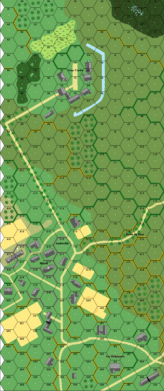 On the night of the 6th June, George Millett, Colonel of the 507th Parachute Infantry Regiment, had come down in a grain field about a thousand yards south of the DZ. He gathered a small force and struck east for Amfreville. But the opposition proved too strong, and they remained holed-up out of harm's way in the countryside to the northwest of the small town. On day three, word came via radio from Division that they were to attempt a breakout, to link up with Timmes on the far side of Amfreville.Attacker: American (Elements of the 507th P.I.R. and Colonel Millett)