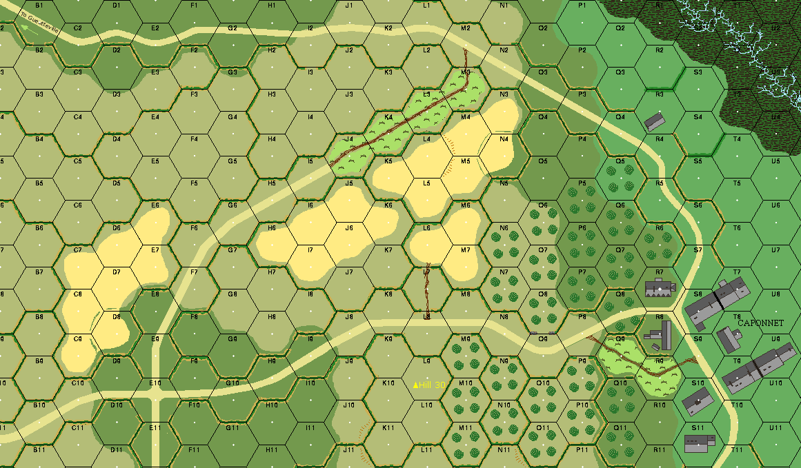 Lt. Col. Shanley's march from the Drop Zone ended around midnight on the Divisional rendezvous: Hill 30. Come the morning of June 7th, Shanley formed his own 2/508 men around the northern slopes of the hill, and gave Major Shields Warren's 1st Battalion men the southern flank. Ammunition was low, food nearly gone, and medical supplies were almost non-existent. In the west, the German garrison at Picauville was venturing out of the town with increasing confidence, and to the north German security patrols were working ever closer to the hilltop. While Shanley contested the high ground against a probing force of 'Osttruppen', themselves strangers in a strange land, his force was written off by the Divisional G2 (intelligence officer) as a 'lost battalion'.Attacker: German (Georgian Security Battalion from the 709th Division, 709th Division Support Elements)