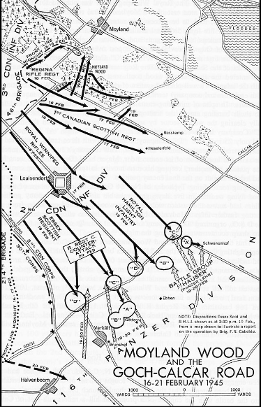 The cutting of the link between the German defenders in Goch and those in the Moyland Wood-Calcar position meant a withdrawal to the next line of defense before the Rhine was inevitable. Hitler’s choice to forbid any directives to army, corps or divisional commanders which would even imply a falling back to the Rhine meant the Germans would have to be dug out of the Moyland Wood yard by yard. . .Attacker: Canadian (Royal Winnipeg Rifles and the Sherbrooke Fusiliers)