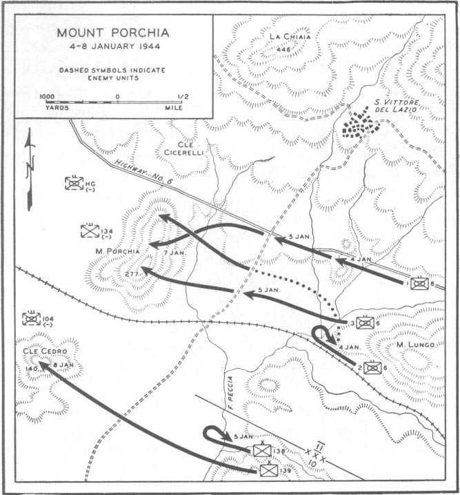 The final phase of the Winter Line campaign opened on 5 January. On the left wing, II Corps offensive involved taking Mount Porchia, just south of Highway No. 6. Task Force A was given the assignment of attacking this isolated hill. The 1st Battalion, 6th Armored Infantry, moved on the afternoon of 4 January to secure its line of departure. The battalion encountered difficulty in clearing the two small rises on either side of the highway. The positions were vigorously defended by the 5th Company, 134th Grenadiers. Losing their positions by 1930, the Germans counterattacked. Until noon of 5 January, the Germans fought to stop the American drive.Attacker: American (1st Battalion, 6th Armored Infantry Regiment)