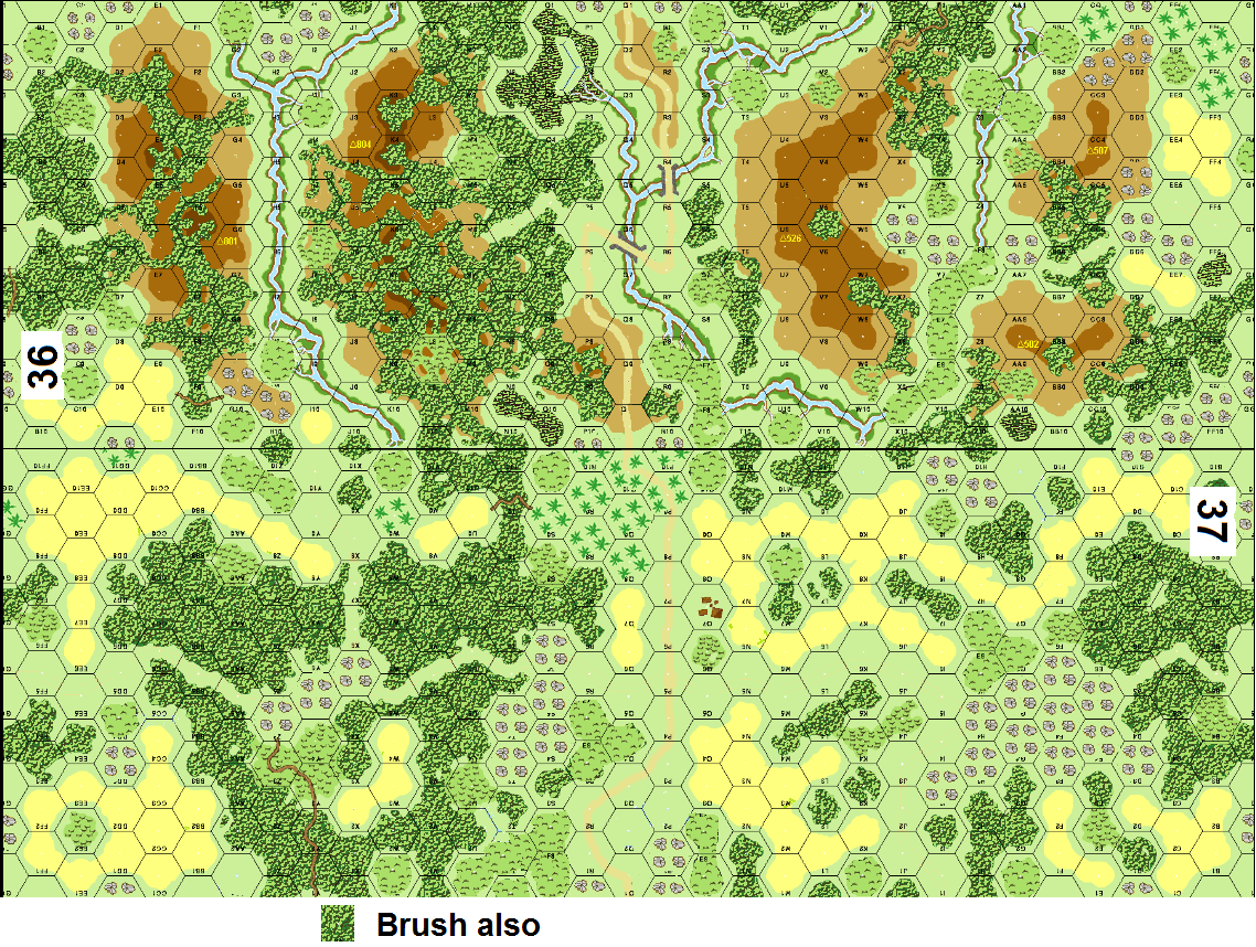 | Misc Rules: | PTO (1 road/Bridges exist). Treat all Jungle/Marsh/Swamp/Bamboo as Brush. Palm Trees are Crags |