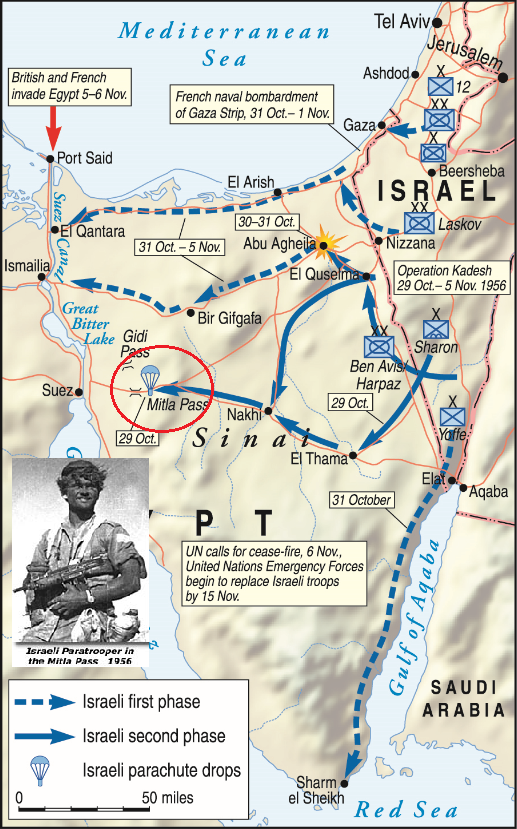 The Mitla Pass is a 480 meter-high, 32 km-long snaky pass in the Sinai of Egypt, wedged between mountain ranges to the north and south, located about 50 km east of Suez. During the Israeli invasion of Egypt in the Suez War of 1956 the pass was captured by the 202nd Brigade of the Israeli army, commanded by Ariel Sharon, without the approval of the Israeli leadership. Sharon faced elements of the Egyptian 2nd Brigade, which had prepared an ambush within the pass. Egyptians pinned down such famous Israelis as Mordechai Gur and Uri Dan under fire throughout the afternoon of October 31, 1956. Aharon Davidi and Rafael Eitan sent in two companies to clear Egyptians from both sides of the pass between 6:00pm and 9:00pm that evening. Israelis suffered 40 casualties and about 120 wounded, while Egyptians had 260 dead. Sharon was criticized for this.Attacker: Israeli (202nd Paratroop Brigade (reinforced))