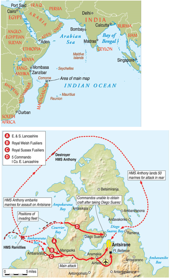 In order to prevent a Japanese incursion into Madagascar such as in Indochina, Britain launched Operation Ironclad to seize the northern ports of Diego-Suarez and Antsirane. The British gathered the 13000 men of the 29th Independent Brigade and the 17th Brigade Group to oppose the 8000 mostly native conscripts and tough Senegalese troops known to be holding positions in Madagascar. The Vichy commanders felt that the islands, shoals and mines would prevent any invasions near the two ports, but were proven wrong by skillful navigation and mine-clearing by the Royal Navy. The landings by the British ground troops were unopposed and Diego Suarez fell easily to a British Commando Squadron. Meanwhile, the 29th Brigade sorted itself out and took the road to Antsirane. Three miles short of the port, they ran into the towns final defense line...Attacker: British (2nd Royal Welsh Fusiliers and the Special Service Tank Squadron)