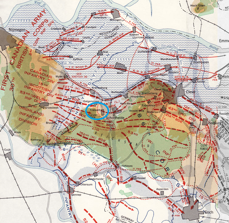 After the first assigned objectives of Operation Veritable had been seized, the 9th Cameronians were to pass through and secure their final first day goal: the Galgensteeg ridge and the village of Frasselt. Meanwhile, the enemy had taken shelter from the unprecedented Allied bombardment in the cellars and houses of Frasselt. By 5:15 P.M., all was ready and Company C, the Cameronian's reserve company, commenced their advance over the 800 yards of open ground separating them from the village.Attacker: British (C Company, 9th Cameronians, 15th Scottish Division supported by elements of 1st Squadron, Coldstream Guards and 79th Armoured Division)