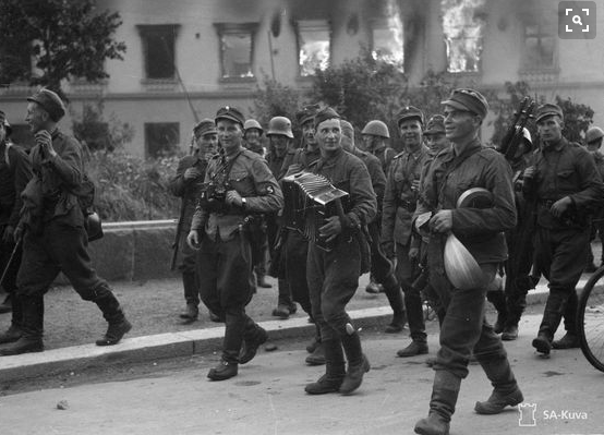 | Finnish troops, having recently liberated Sortavala, are entertained in the streets by the last of the surrendered Soviet troops, 15 August 1941 (sortvala finn.png) | Image | hoxson1 | 1303 |