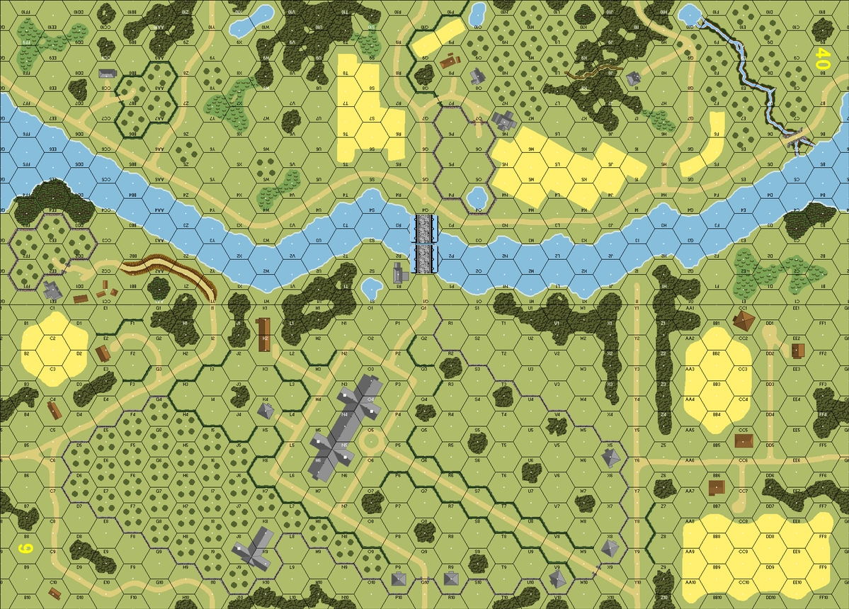 | Delete from HSR 1: Hills do NOT exist (no need for it as it is stated in HSR 2). HSR 2 should read: Place bridge counters in hexes 40Q2-Q3. This is a two-lane, stone bridge. No hills exists, treat as level 0. All other terrain features atop the hills exists normally. | HOB |