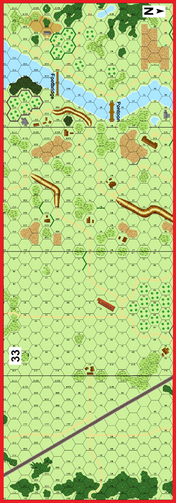 | Misc Rules: | Woods between river and RR: Brush. D: Air Support (E7) |