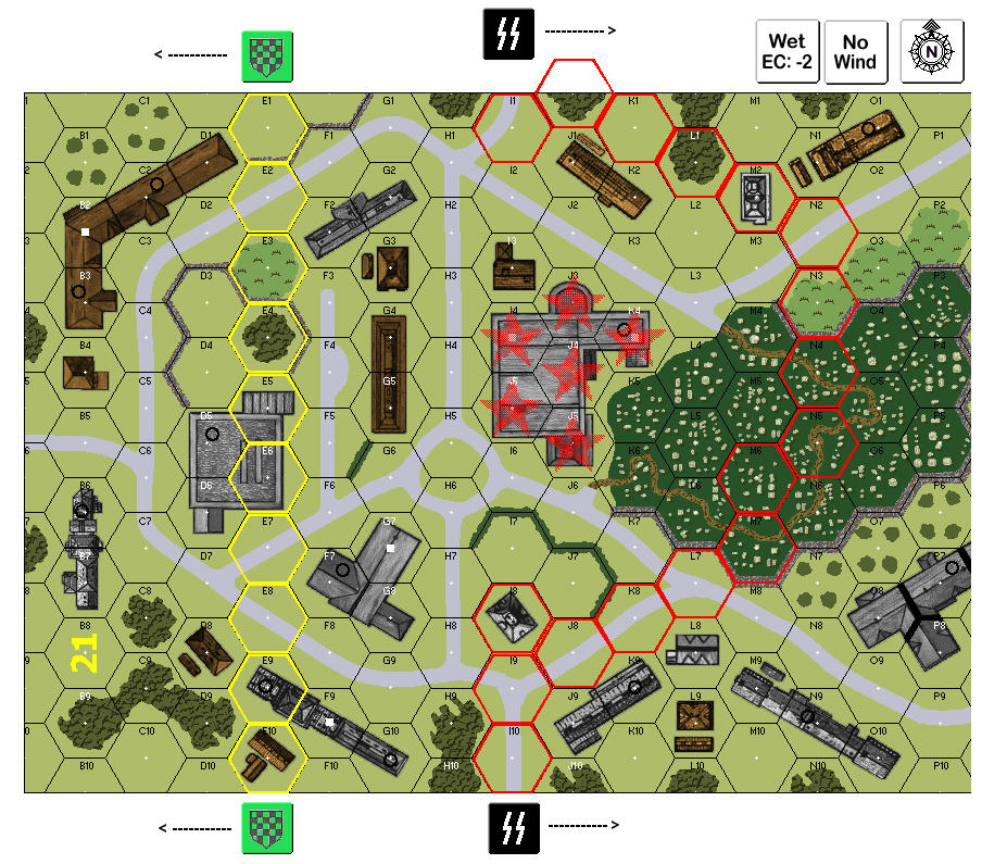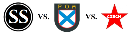 On the day the war ends in Europe, the fighting in the city of Prague is just approaching a crescendo. German units - still in control of the city - are battling the local Czech partisans who started the Prague Uprising several days previously. The partisans, desperate for help in any form, invite the Russian Liberation Army to fight the Germans for them, in return for asylum once the war ends. Unfortunately for the Russians under General Vlasov, the communist partisans have no intention of allowing Russian traitors asylum, and brutal three-way fighting erupts throughout the city.. . . . . One of the few, if not the only, ASL scenarios ever published involving 3 players where all three players are fighting both other sides. The partisans sport a French armored car with a 12.7mm main armament. The SS has the use of a couple of powerful tank destroyers and a Pz38(t), while the ROA has a couple of captured T-34s, a Hetzer, and a few German halftracks, one of which is armed with flamethrowers. To top it off, all three sides are given some form of panzerfaust ability, and the partisans and SS each have a panzerschreck. You can just imagine the carnage of scrap metal that results.Attacker: German (SS) vs. ROA (SS Panzer Division 2 (Das Reich) | 1st Regiment, 1st Division, Russian Liberation Army)