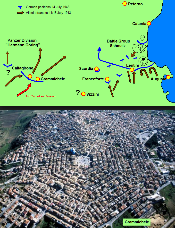 The British Eighth Army's drive stalled in the face of the stubborn and skilfull German defense, Montgomery had to turn to the US 7th Army for help, only to discover that most of the Americans had gone off in the opposite direction. This forced the Eighth Army into a gruelling campaign in adverse conditions against a determined and resourceful enemy in easily defended terrain. His only chance to salvage success lay with the one formation of his army that had not fought in the desert, the First Canadian Division. Moreover, he was pinning the Eighth Army's hopes on the efforts of a single untried division of Canadians. Outside Vizzini, the Hastings and Prince Edward Regiment (Hasty P's) passed through the Royal Canadian Regiment as the First Brigade led the way to the paved Route 124, the infantry riding in lorries or on tanks of the Three River Regiment. The next major town was Grammichele, ten miles from Vizzini. The Hasty P's and the Three Rivers tanks ran right into the German ambush.....Attacker: Canadian (Hastings and Prince Edward Regiment supported by the Three Rivers Regiment)