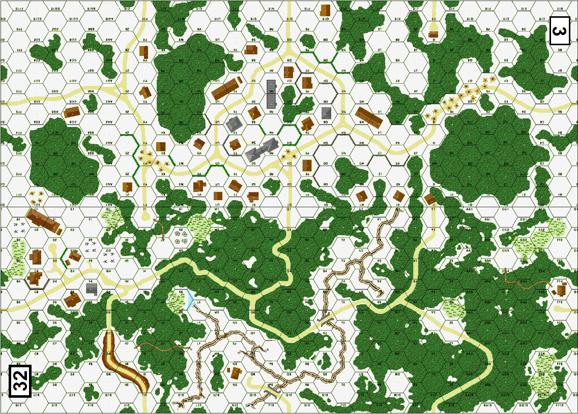 | Misc Rules: | GS, Night rules, 3 hills are Woods instead. Bd 32 stream is gully |