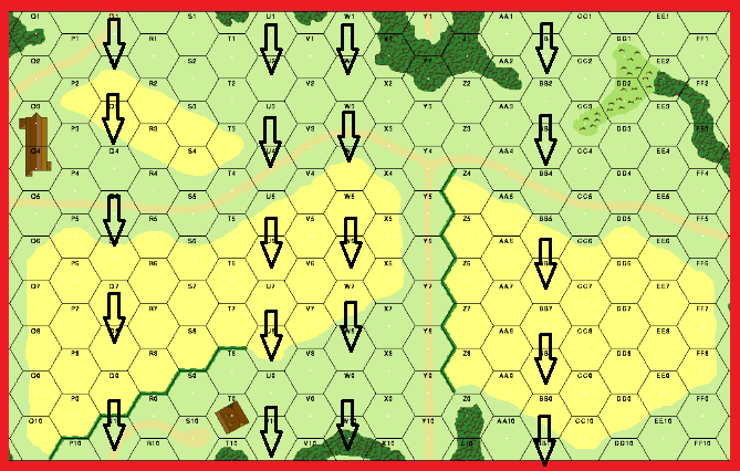 Solitaire exercise - This scenario is meant to be a skill building exercise to help you learn the rules and tactics for Close Assault of AFVs (Reaction Fire D7.2). Tanks enter on 4 rows and when they hit a Concealment counter, dr is made for what is there. Could be nothing, could be DC, etc.Attacker: German (20th Panzer Division)