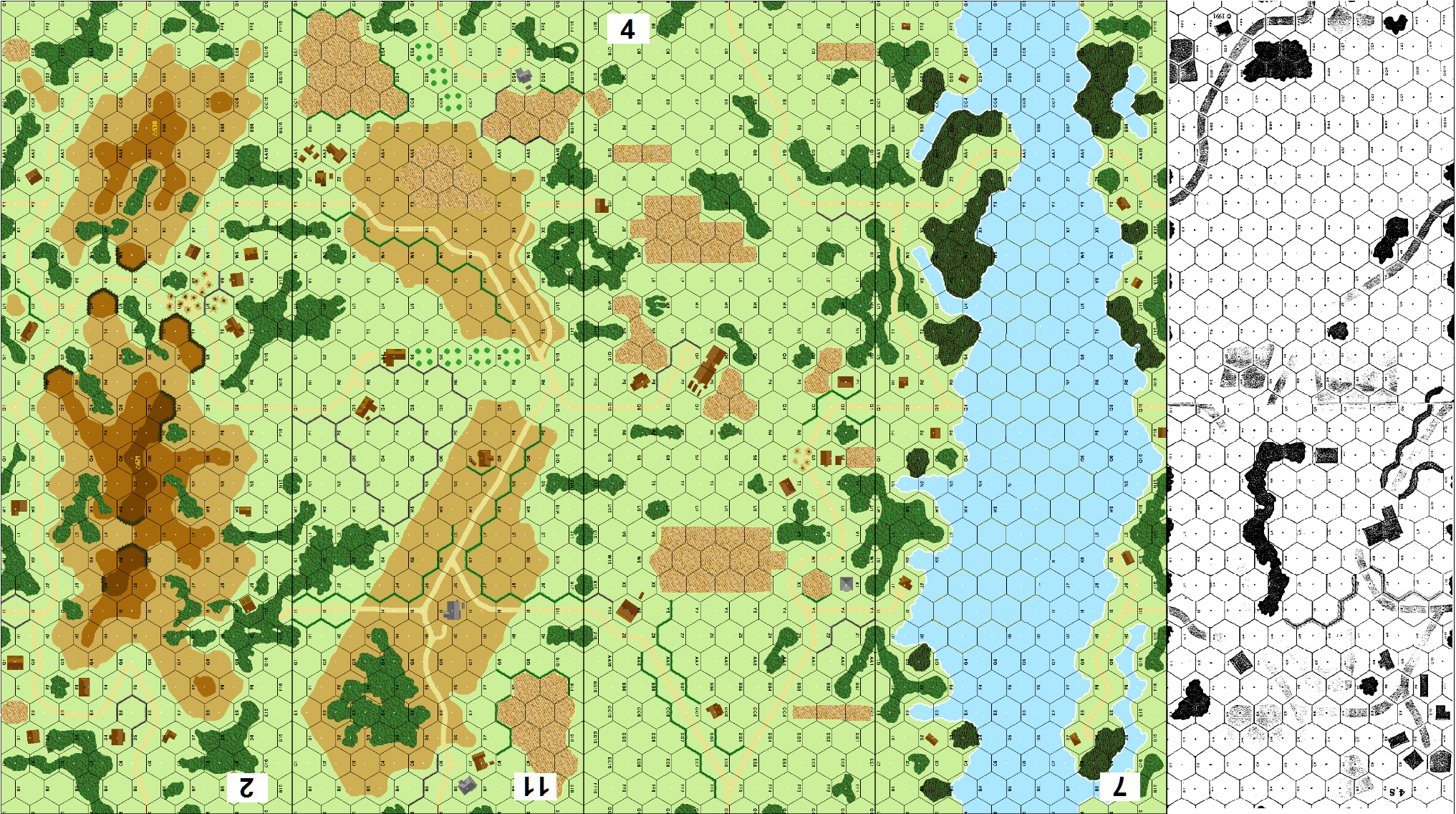 Guderian's XIX Panzer Corps with the 3rd Panzer Division was the southern wing of the German offensive. The success of its crossing of the Meuse was necessary to prevent the French Army from narrowing the penetration. Led by the Infantry Regiment Großdeutschland, the 1st Panzer Division bore the brunt of the assault. (NOTE: the white board in the display is map 4S which appeared in OAF Playtester's Journal 4. It is not a winter board, only could find a black and white version)Attacker: German (1st Panzer Infanterie-Regiment Großdeutschland and Battalion Assault Engineers and Artillery from 2nd and 10th Panzer Divisions)