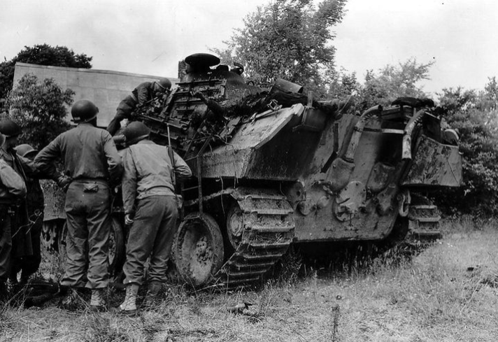 American soldiers inspect knocked out Panther tank (PzKpfw VG) in Le Bras, Normandy