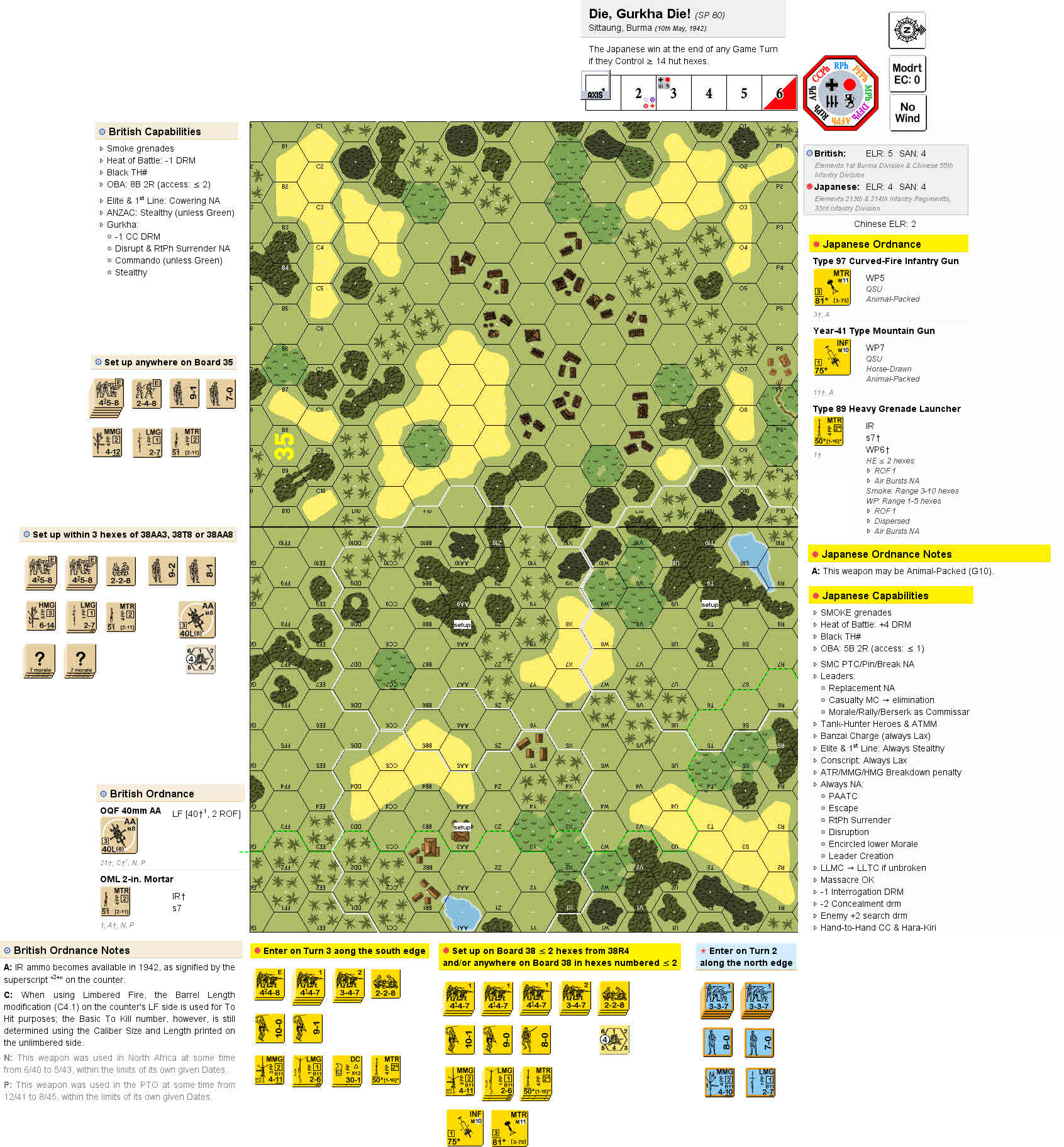 Near the Irrawaddy River Lt. General Chen Li-wu's 6th Army was in full retreat. The British were under constant pressure from the Japanese, whose vanguard was snapping at the heels of the Gurkha Commando Group. Despite the loss of communication with HQ, the Gurkhas executed a fighting withdraw in the face of Japanese infiltration tactics. The pursuit was so close that at one point a Bofors AA gun dueled pointblank with a Japanese infantry gun, which lost the duel in an explosion that sent it flying through the air and killing its crew. The Gurkhas were desperately buying time for the main allied force to cross the Irrawaddy when timely reinforcements from the Chinese arrived . . .Attacker: Japanese (Elements 213th & 214th Infantry Regts, 33rd Infantry Division)