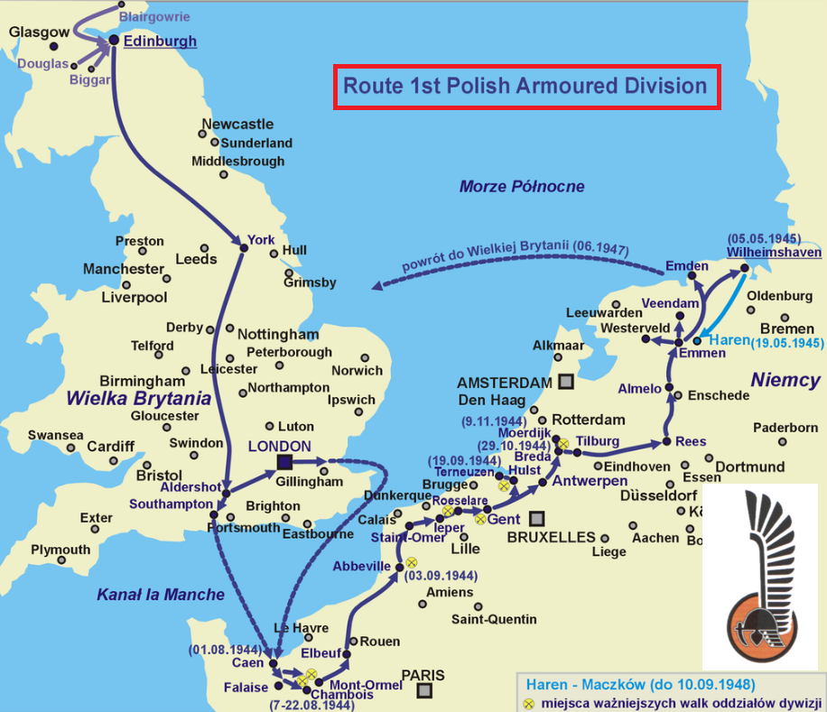 Route of 1st Polish Armor Division in WW2. Armed in England, they pursued the Germans along the coast of the English Channel. It liberated, among others, the towns of Saint-Omer, Ypres, Oostnieuwkerke, Roeselare, Tielt, Ruislede, and Ghent.