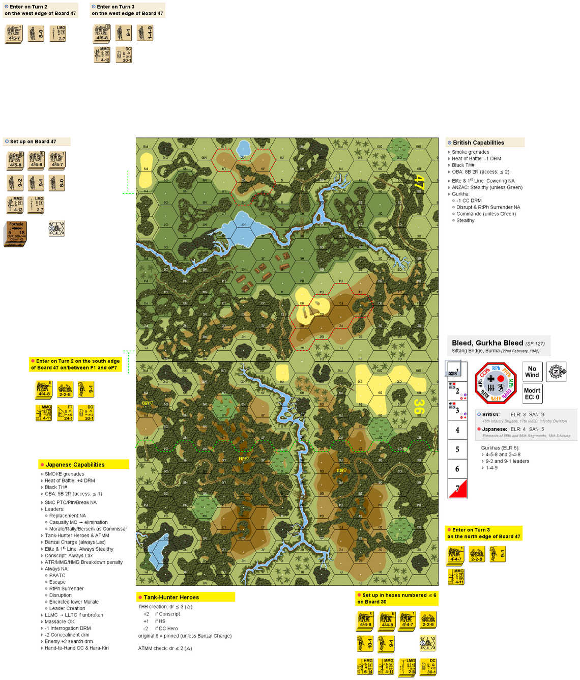 The Japanese 18th Division, under the command of Lt. General Renya Mutaguchi, was advancing his 55th and 56th Regiments toward the only major bridge across the Sittang River. If he could capture this bridge intact, he could then advance on to Rangoon which was a major source of supplies and reinforcements to this part of Burma. The British 48th Infantry Brigade, 17th Indian Division was tasked with slowing down the Japanese advance. The rest of the division needed time to move the last of the supplied and equipment across the bridge. They ran into problems when a truck broke down half way across and could not be removed.Attacker: Japanese (Elements of 55th and 56th Regiments, 18th Division)