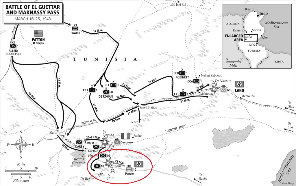 Commanded by General George S. Patton, the U.S. II Corps attacks against elements of the Italian Centauro Division along the roads leading to Gabes were becoming a concern to Army Group Afrika. A breakthrough there could potentially reach the coast and cutoff the retreat of the German/Italian 1st Panzer Army. To deal with this threat, the veteran 10th Panzer Division was released from reserve and would attack the U.S. 1st Infantry Division just east of El Guettar. Alerted by intelligence, Patton made sure the 1st Infantry Division was well prepared for the attack. . .Attacker: German (Elements of Panzer Regiment 7, Panzergrenadier Bataillon II./69 and II./86, Kradschutzen Bataillon 10 and Panzerjager Kompanie 1./90)