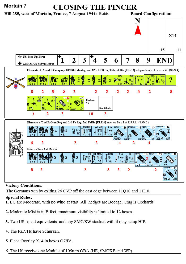 | Misc Rules: | Hedges: Bocage (B9.5), Crags: Orchards, Mist (E3.32) 12 Hex Visibility. A: PzVIH: Sz (D11.2) |