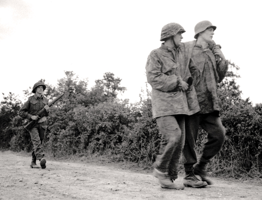 German prisoners are escorted by a Canadian soldier at Buron, France, July 7, 1944.