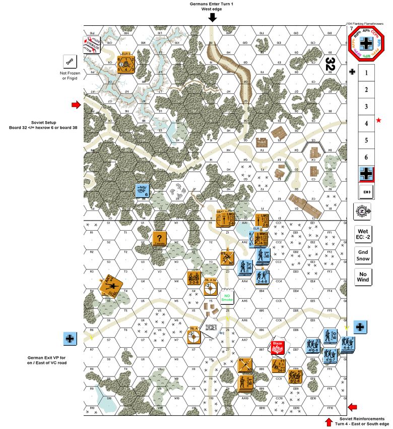 I got the attacking Germans and sent my attack at Jim's right flank. My objective was to take building 32C1 and make it a firebase to cover a rush to the 38EE7 woods. I sent one 467 to the frozen stream to check if any [?] there were real Russians. I got both Panzers and three squads with two leaders to the VC road by GT4. The trick was staying unbroken! The fire from my kill stack in 32C1 did the trick and I rushed squads past the VC road for a solid win. Jim: Vic's fire and SMOKE was very effective early, and I was down 10 CVP in three turns. I broke some attacking squads, but I couldn't get the double breaks needed to reduce or kill MMC. My 8-1 and HS going berserk and rushing to their deaths didn't help! The reinforcing AEs had to break all or kill all the Germans east of the VC road (and help the 76L kill the Panzers). I got the Panzers but not the squads. By turn 6, I had two GO 628s left and that's how it ended. Vic had 7 squads east of the VC road and 20 VP to my 13. It's a good scenario that challenges both players.