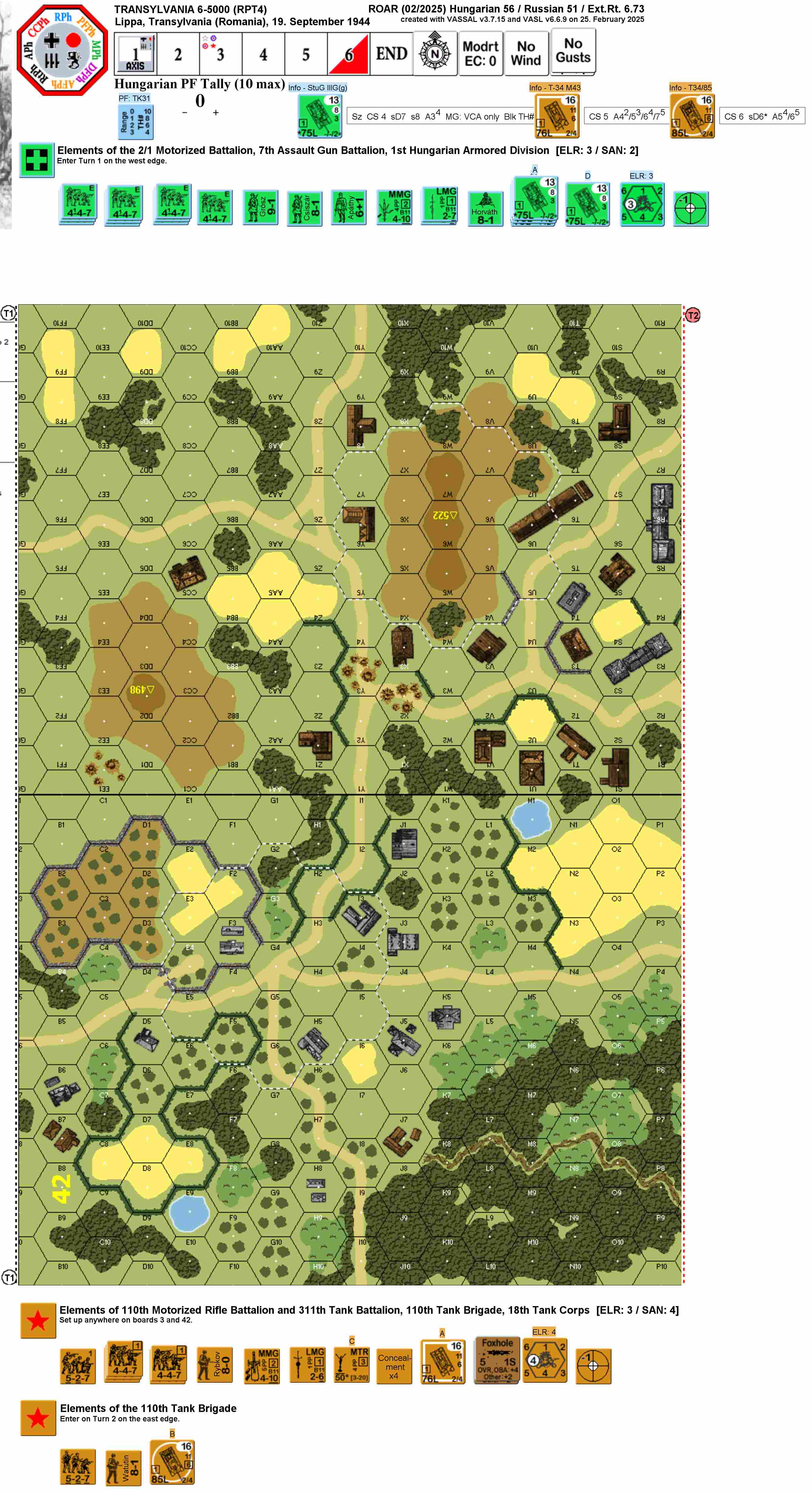 Colonel Koszorous' 1st Hungarian Armored Division had taken Arad and was continuing its drive on Lippa. Koszorous' mission was to prevent the Soviet 2nd Ukrainian Front getting any closer to the Hungarian frontier. Nearing Lippa, the Hungarians slammed into the Soviet 110th Tank Brigade. A fierce tank battle ensued between the Hungarian 7th Assault Gun Battalion and Soviet T-34s.Attacker: Hungarian (2/1st Motorized Btn & 7th Assault Gun Btn, 1st Armoured Division)