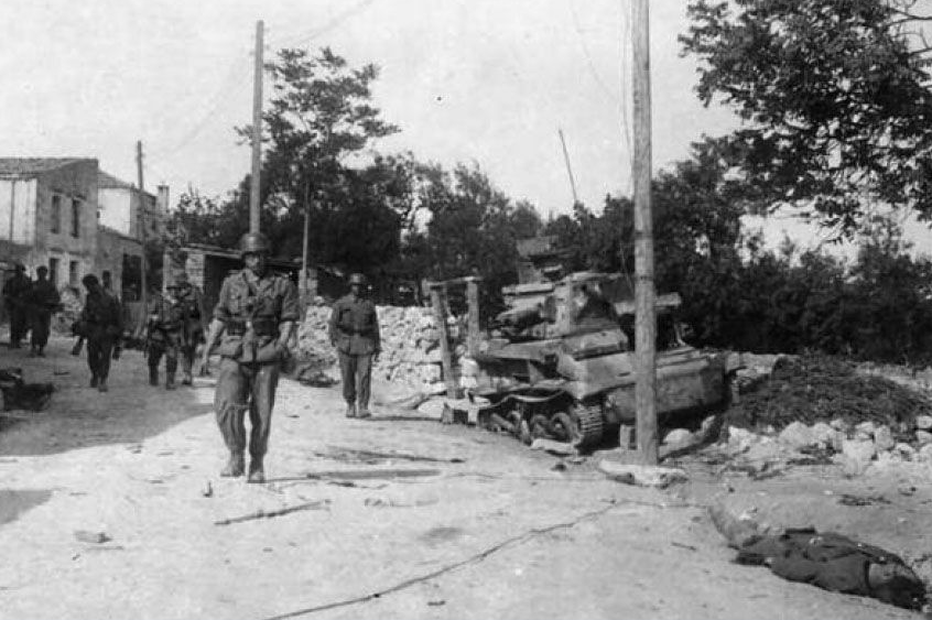 Securing Maleme airfield gave the Germans the initiative. Heavily reinforced, they began advancing eastwards towards Canea, while a sizeable force threatened the New Zealanders’ flank from Prison Valley. In an effort to stem the German advance in that sector, on 25 May Brig Kippenberger directed the now famous counter-attack by his makeshift 10th Bde that recaptured the hilltop village of Galatas at bayonet-point. This proved only a temporary tactical success; increasing pressure by the Germans, who made good use of their command of the air by bombing the defenders almost continuously, obliged the Allied forces to withdraw to the east to avoid being surrounded.Attacker: German (Kampfgruppe Ramcke/ 2nd Battalion, 100th Regiment, 5th Gebirgsjäger Division)