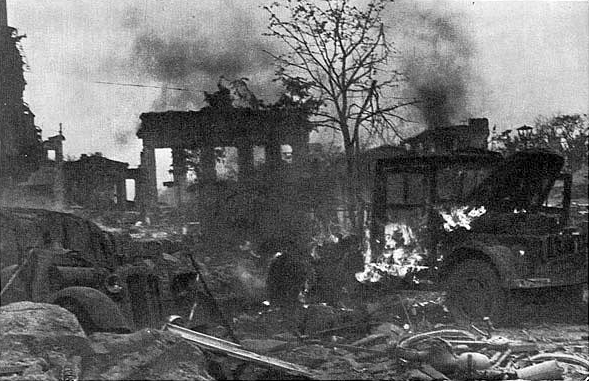 "The Sunset" -- The ruins of Hitler’s capital found some of its most fanatical defenders in units of foreign volunteers. With no more than 50 men under his command, Ezquerra’s group fought alongside the other foreign volunteer units in the last battle of the Thousand Years Reich. The 25th of April found Einsatzgruppe Ezquerra fighting around the Moritzplatz and the Air Ministry along with a Latvian S.S. Battalion.Attacker: Russian (Elements of the 9th Rifle Corps)