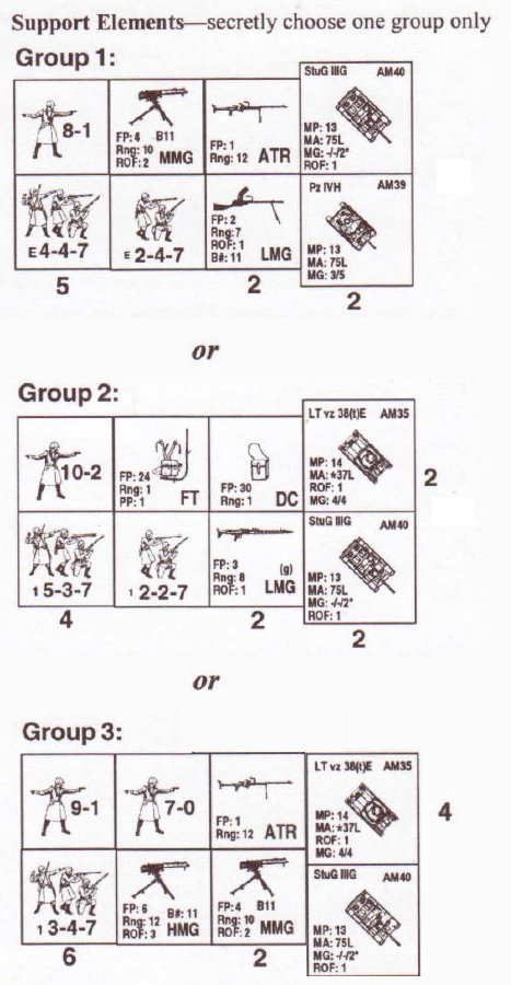 | Misc Rules: | NQ / H-t-H in effect both sides. D: FB1, Variable OB choices (armor 3 to 5 + infantry and SW) |
