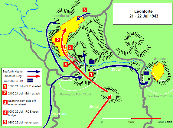 Lt. Col. Jefferson’s Battalion Headquarters along with C and D Companies of the Edmonton Regiment, Canadian 2nd Infantry Brigade conducted a night assault on the town of Leonforte. The Edmontons penetrated to the heart of Leonforte and were met by a vicious counterattack by German infantry, loaded with machine guns and supported by tanks. A handwritten message, entrusted to an Italian boy, reached Brigadier Vokes who brought two 6-pounder anti-tank guns and tank support from the “Three Rivers Regiment” and additional forces from the Princess Patricia Light Infantry in the action to help the Edmontons.Attacker: German (Elements 15th Panzergrenadier Division)
