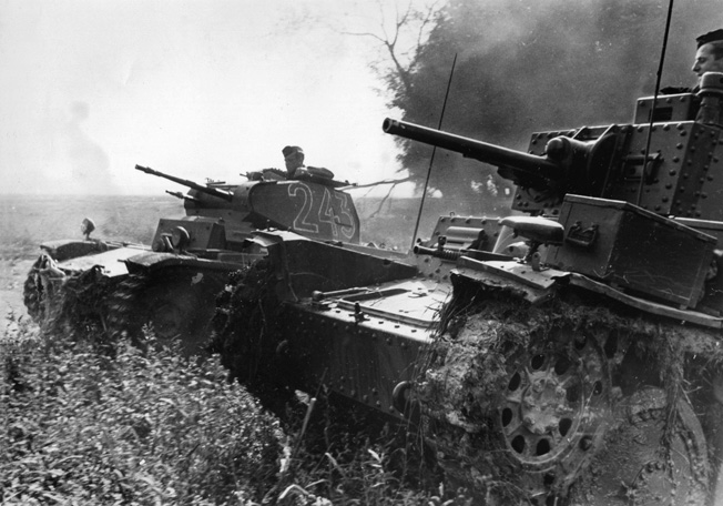 By the third day of Barbarossa, Reinhardt’s XLI Corps had pushed the Russian 125th Rifle Division back 50 miles. In broken, wooded terrain near the village of Raiseinai, the Germans were hit by a Russian armored counterattack. They quickly discovered that Russian weapons, though crudely made by western standards, were sturdy and deadly. As reports came in of the successful counterattack, Reinhardt ordered 1st Panzer Division to strike the Soviet flank. Unlike the French and Poles, the Russians did not surrender. . .they fought bitterly.Attacker: German (6th and 7th Companies, 1st Panzer Division)