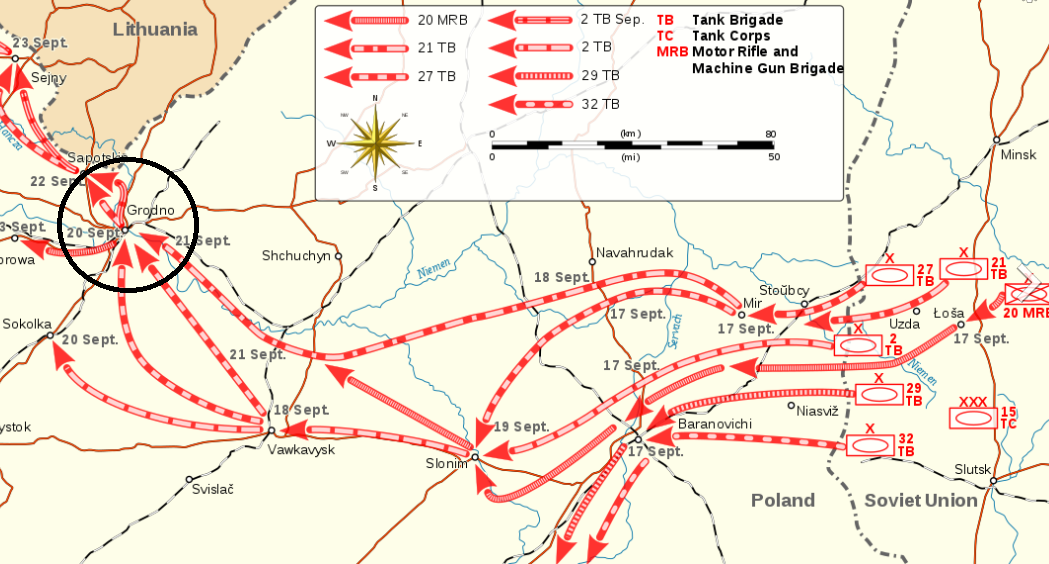 Ill-equipped, undermanned and lacking any anti-tank artillery, the Polish defenders relied mostly on improvised anti-tank means such as bottles of gasoline or turpentine, small arms fire, and anti-tank obstacles. On 20 September, the tanks of the Soviet 27th Light Tank Brigade of the 15th Tank Corps reached the city's outskirts. Although both numerically and technically superior, the Soviet forces lacked infantry support and oil, which stopped many tanks. Also, the tank crews had no experience in urban warfare, which was a significant help for the defenders. The Soviets tried to seize the city from the south through the bridge over the Niemen River.Attacker: Russian (27th Light Tank Brigade, 15th Tank Corps)