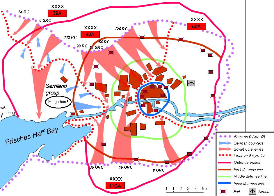 By April of 1945, the city of Königsberg was virtually surrounded. One last tenuous connection to the outside world being the road to Pillau on the coast. On April 5th, the Russian colossus was set to crush the stronghold. The first stage was a massive attack from the north of the city. When the road to Pillau was cut, the Germans formed Operational Group Zemland to launch a counterattack at the village of Metgeten to attempt to reopen the road.Attacker: Russian (39th Army, Baltic Front)