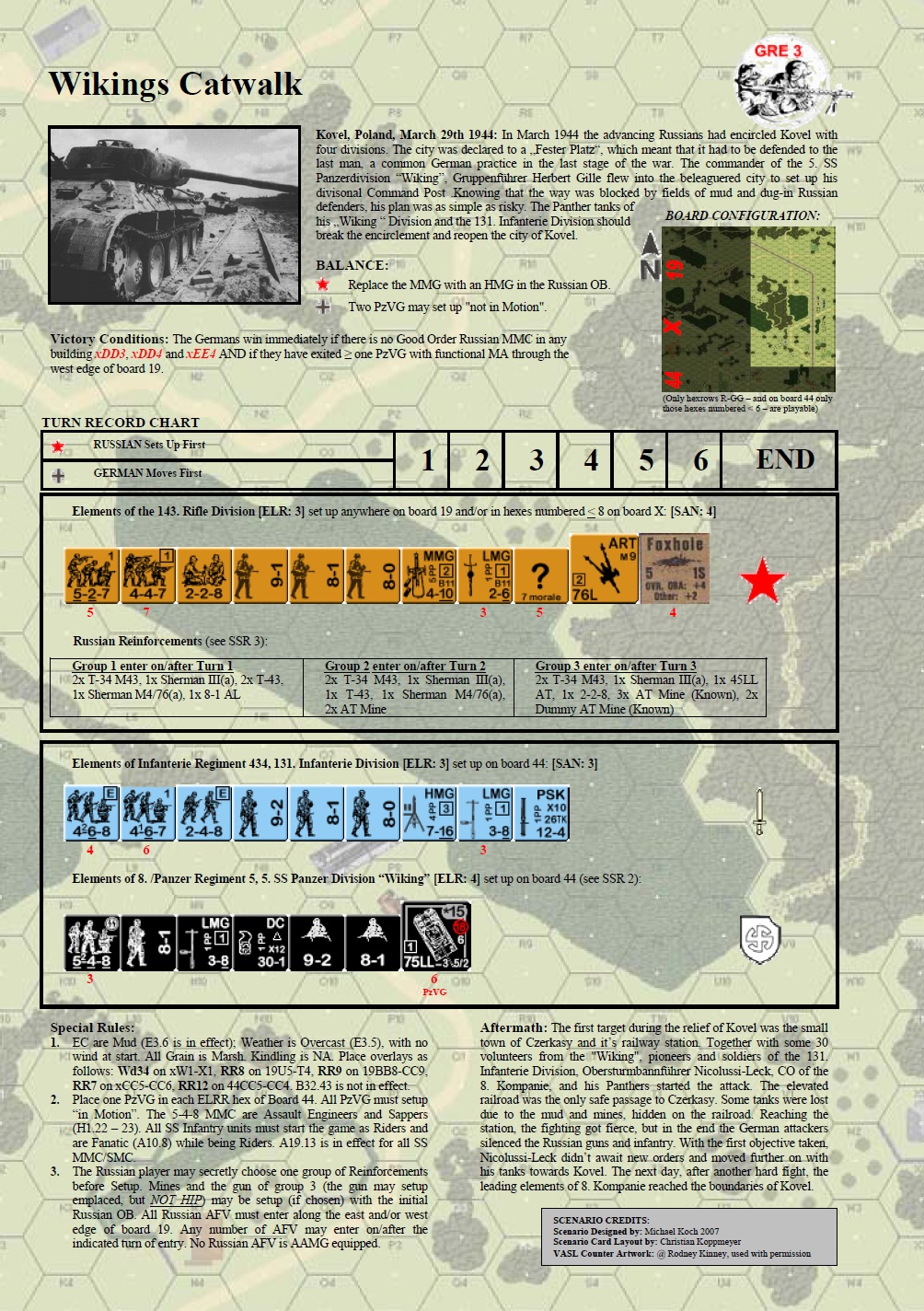 In March 1944 the advancing Russians had encircled Kovel with four divisions. The city was declared a "Fester Platz", which meant that it had to be defended to the last man, a common German practice in the last stage of the war. The commander of the 5. SS Panzerdivision “Wiking”, Gruppenführer Herbert Gille flew into the beleaguered city to set up his divisonal Command Post. Knowing that the way was blocked by fields of mud and dug-in Russian defenders, his plan was as simple as risky. The Panther tanks of his "Wiking" Division and the 131. Infanterie Division would break the encirclement and reopen the city of Kovel. The first target during the relief of Kovel was the small town of Czerkasy and it’s railway station. Together with some 30 volunteers from the "Wiking", pioneers and soldiers of the 131. Infanterie Division, Obersturmbannführer Nicolussi-Leck, CO of the 8. Kompanie, and his Panthers started the attack. . . . The Russians have variable reinforcements in this one, 3-6 tanks, an AT gun and/or some AT mines.Attacker: German (SS) (5th SS Panzer Division / 131 Infanterie Division)