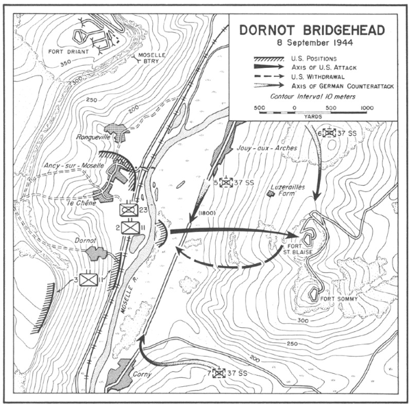 After a fruitless attack versus Fort St.Blaise and Fort Sommy on the east bank of the Mosel, Companies F and G of the 11th Infantry found themselves back again in their starting positions, a small, horseshoe formed, wooded perimeter with the river banks in their backs. Together with units from the 23th Armored Infantry Battalion and some support from self-propelled guns west of the river, they defended the bridgehead bitterly against the experienced men of the 17. SS Panzergrenadier Division. Time and again the Germans attacked the dug-in Americans – with no success. But for how long would the decimated defenders be able to hold the line?Attacker: German (SS) (17th SS Panzergrenadier Division)