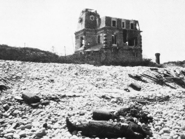 Any unit landing directly in front of a German strongpoint was likely to have a long, hopeless day. Most of Major Bingham's 2nd Battalion, 116th Infantry, had the misfortune of touching down near the mouth of the D-3 Les Moulins draw. In the first hour of the invasion, the intricate defensive works in this area, including Wn 66, had allowed the Germans to pound the invaders in very light losses to themselves. Most interesting in this area was a three-story house just behind the shingle with mansard roof and tower. Although naval and tank fire heavily damaged the structure, the defenders were still in action, especially the special fortified machine-gun nest .Attacker: American (Company F, 116th RCT and Engineer units))