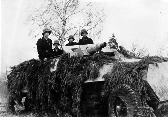 SS-Unterscharführer Kaspar Sporck (left), born in Holland, with his Dutch comrades on his very successful Sd.Kfz. 251/9. He was decorated with the Knight’s Cross on 23 October 1944 for destroying 14 Soviet tanks in the Courland Peninsula with this vehicle