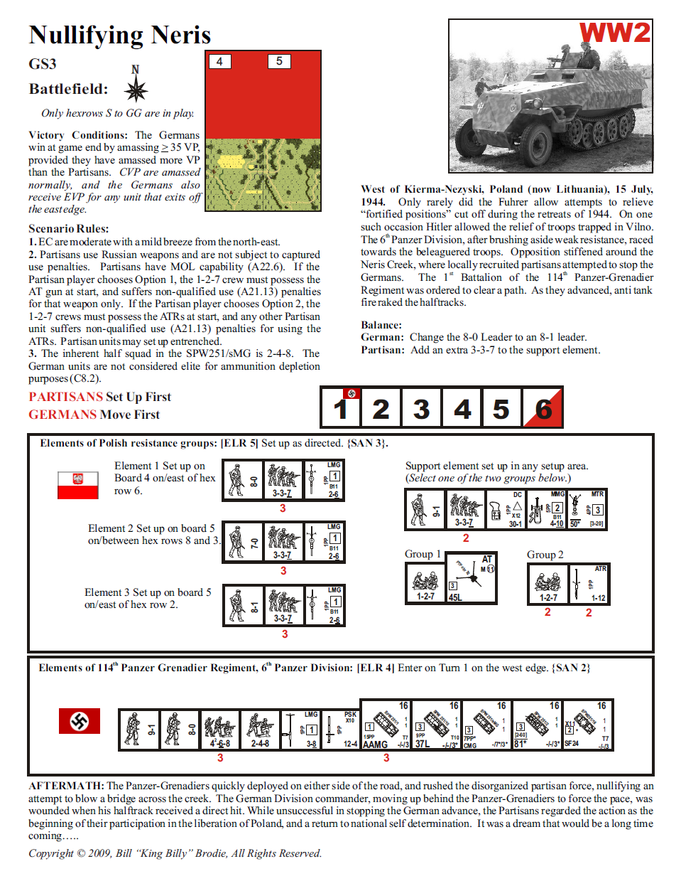 Only rarely did the Fuhrer allow attempts to relieve “fortified positions” cut off during the retreats of 1944. On one such occasion Hitler allowed the relief of troops trapped in Vilno. The 6 Panzer Division, after brushing aside weak resistance, raced towards the beleaguered troops. Opposition stiffened around the Neris Creek, where locally recruited partisans attempted to stop the Germans. The 1 Battalion of the 114 Panzer-Grenadier Regiment was ordered to clear a path. As they advanced, anti-tank fire raked the halftracks.Attacker: German (114th Panzer Grenadier Regiment, 6th Panzer Division)