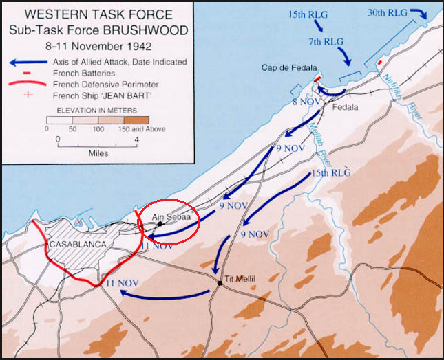 “Operation Brushwood” involved Colonel Satzmann's BLT-2-7 landing north of Casablanca and capturing the city. The landing itself was easy, but as the Americans drove south and neared the suburbs, they endured increasing artillery shelling. Then caught in the open fields they were raked by French machine guns and small arms fire, as well as three artillery pieces that fired into their ranks over open sights. The first wave of U.S. Forces was decimated and fled to the rear in confusion, taking shelter behind a railway embankment. However, three of the American platoons from Companies E and G performed bravely and held out, positioning themselves for a continuation of the attack.Attacker: American (Elements of E and G Companies, 7th Battalion, 2nd Beach Landing Team)