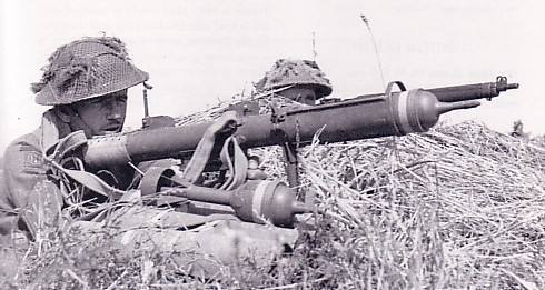 On the second day of the Epsom battle, 5th Duke of Cornwall Light Infantry had moved forward to relieve the Cameronians. Failing to make contact with the Scots, the lead company of the DCLI was digging in to a small orchard west of the devastated village when the right flank of 2nd Panzer Division's counter-attack swept over them. With Panther tanks literally on top of the infantry's slit trenches, the shout went up for PIATS.Attacker: German (2nd (Wien) Panzer Division)
